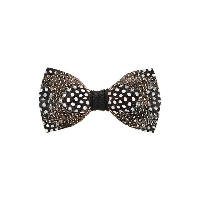 A Brackish twist on classic polka dot, the Guinea bow tie is crafted to showcase the beautiful variety of natural dots and colorations of black, brown, grey and white of the guinea fowl. Each feather is carefully layered to create a unique pattern of dots from one end of the tie to the other.