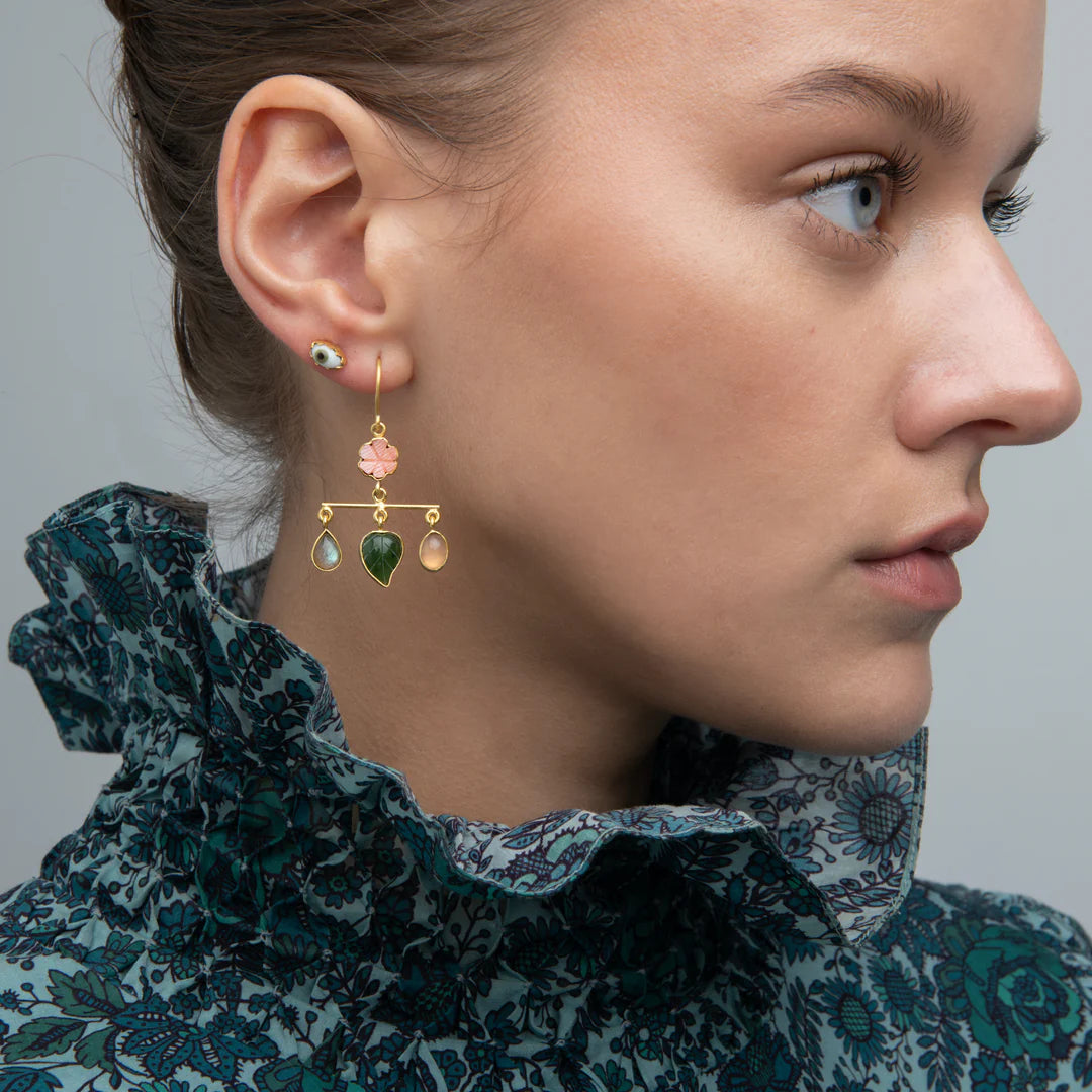 Materials: Ethically sourced 18k gold-plated silver, chalcedony, coral, jade, labradorite, peridot, prehnite, raw malachite and rhodonite.