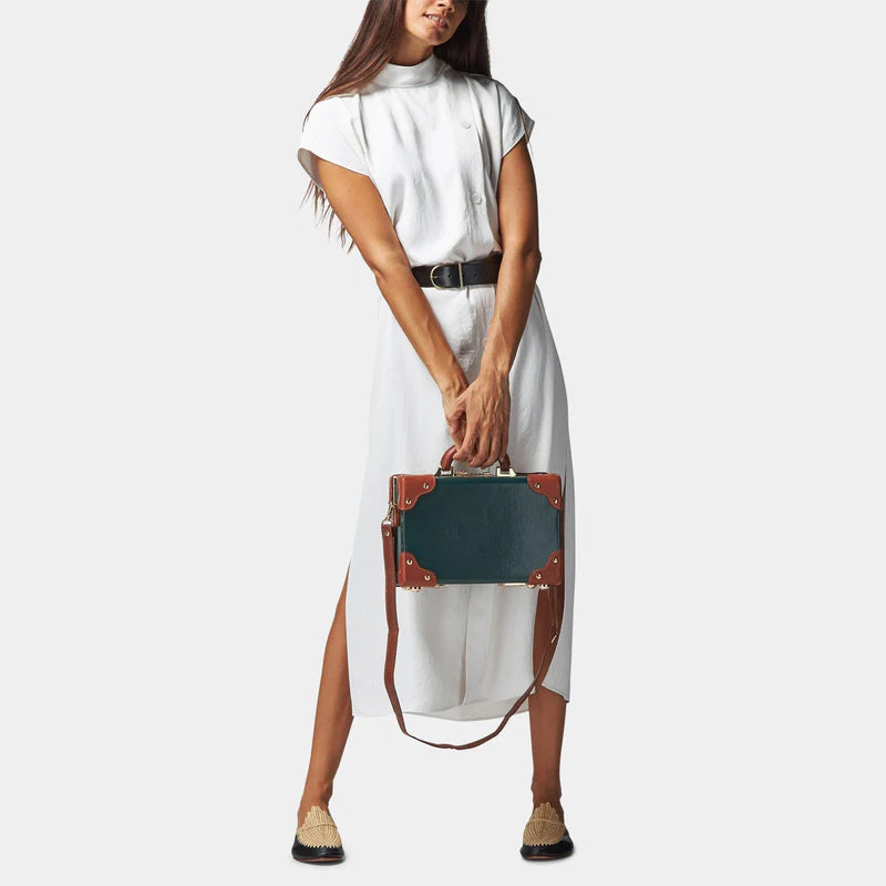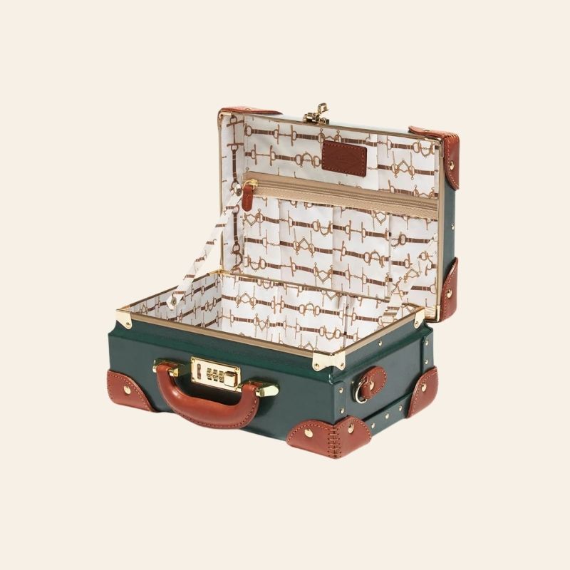 The all-leather Diplomat Hunter Green trousseau, elegantly lined with a snaffle-bit print and complemented by rich tan leather and gold hardware, epitomizes sophistication and versatility.