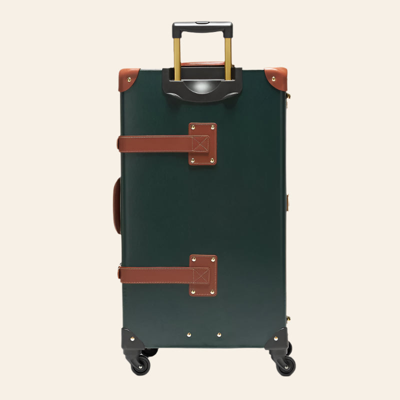 The all-leather Diplomat Hunter Green Check-In suitcase is elegantly lined with a snaffle-bit print, features rich tan leather accents and complemented by gold hardware, including a telescopic handle.