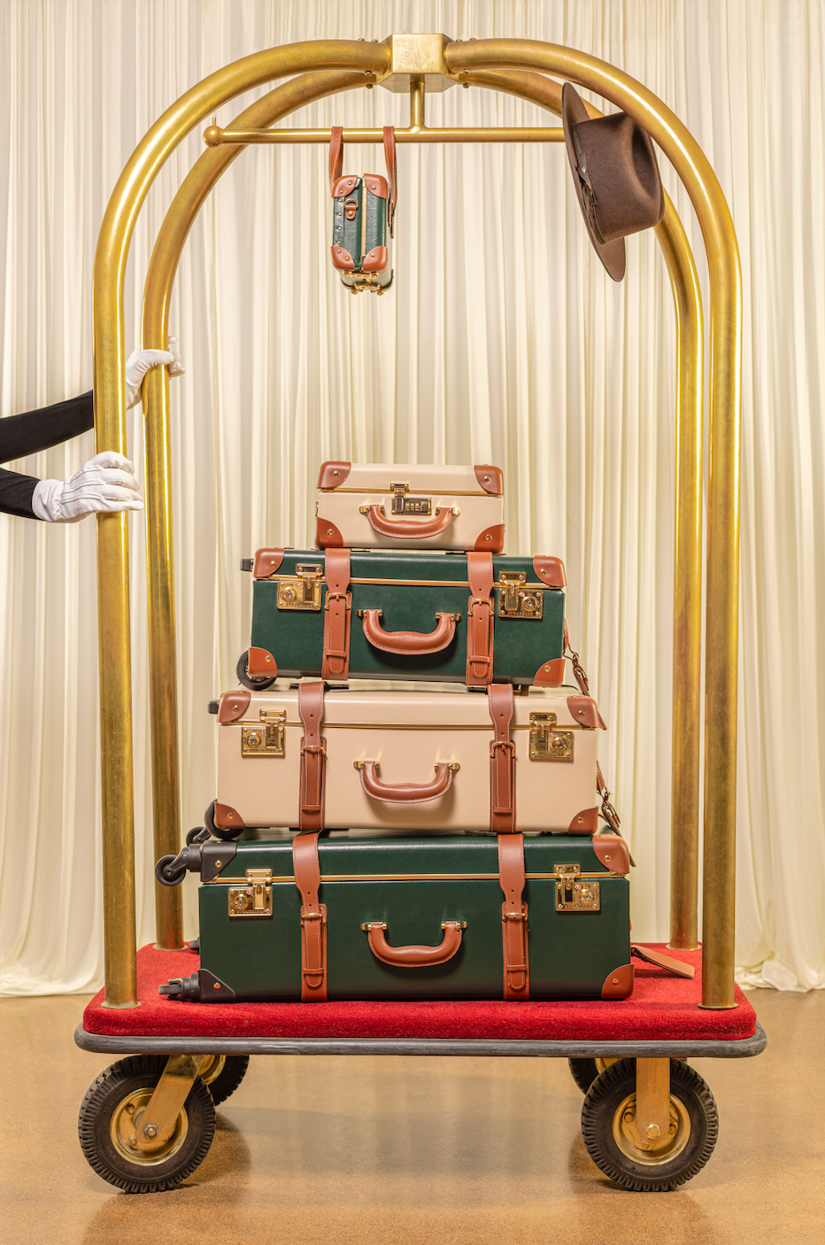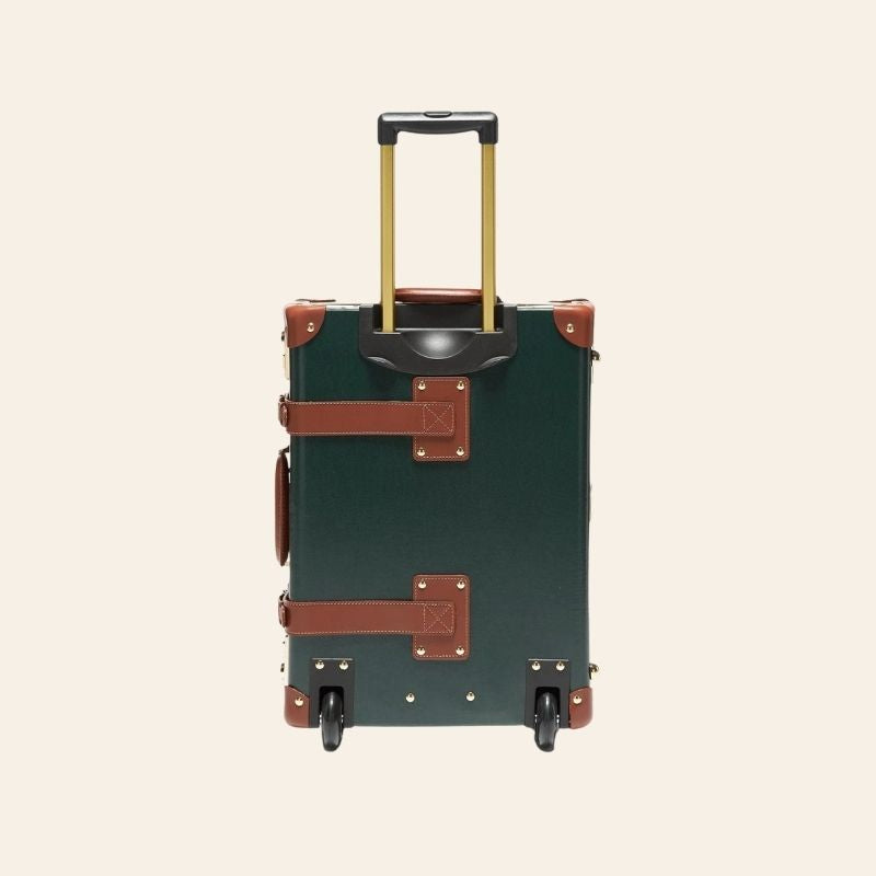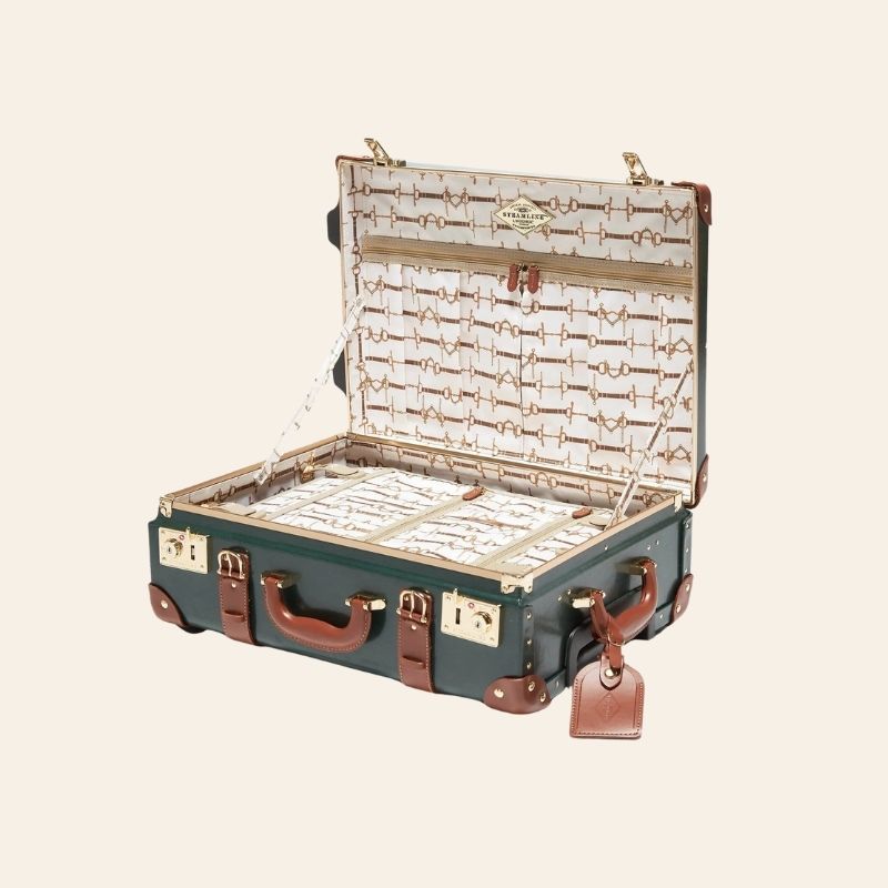 The all-leather Diplomat Hunter Green Carry-On, adorned with a snaffle-bit print interior, features elegant tan leather accents and gold hardware, including a gold telescopic handle.